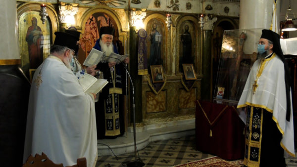 Ο Σεβασμιώτατος στο σύντομο λόγο του ανέφερε ότι στον ίδιο Ναό την 1η Απριλίου 1821 τελέστηκε Δοξολογία για την απελευθέρωση της Λιβαδειάς από τον Μητροπολίτη Αθηνών Διονύσιο, τον Επίσκοπο Σαλώνων Ησαΐα και τον Επίσκοπο Ταλαντίου Νεόφυτο, παρόντων του Αθανασίου Διάκου, του εκπροσώπου της Φιλικής Εταιρείας Αθ. Ζαρείφη και σύσσωμου του λαού της Λιβαδειάς. Και ευχήθηκε Χρόνια πολλά, ευλογημένα, υγιεινά και αισιόδοξα σε όλους τους Λιβαδείτες, οι προσευχές των μαρτύρων και των ηρώων του ’21 να βοηθήσουν και στη δική μας απαλλαγή από τη σύγχρονη λαίλαπα του κορωνοϊού, που μας ταλαιπωρεί και να είμαστε αντάξιοι διαχειριστές της παρακαταθήκης, που μας παρέδωσαν οι πρόγονοί μας μάρτυρες και ήρωες.