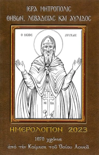 Εξεδόθη και κυκλοφορεί το Εγκόλπιο Ημερολόγιο του  έτους 2023 της Ιεράς Μητροπόλεως Θηβών, Λεβαδείας και Αυλίδος, το οποίο είναι αφιερωμένο στα 1.070 χρόνια από την Κοίμηση του Οσίου Λουκά.