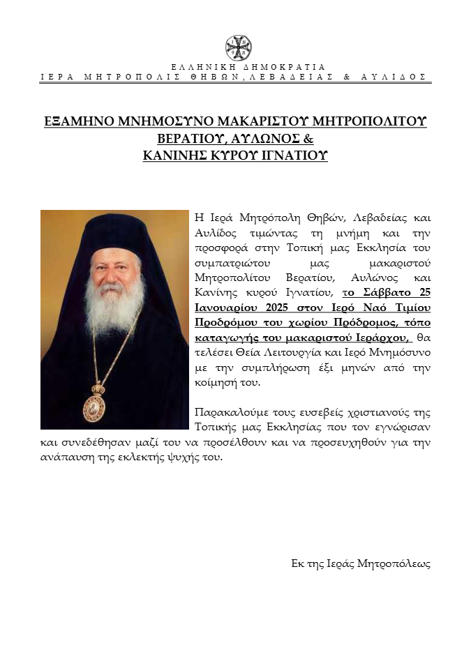 Η Ιερά Μητρόπολη Θηβών , Λεβαδείας και Αυλίδος τιμώντας τη μνήμη και την προσφορά στην Τοπική Εκκλησία του Μακαριστού Μητροπολίτου Βερατίου, Αυλώνος και Κανίνης κυρού Ιγνατίου, το Σάββατο 25 Ιανουαρίου στον Ιερό Ναό Τιμίου Προδρόμου του χωρίου Πρόδρομος, τόπο καταγωγής του μακαριστού Ιεράρχου, θα τελέσει Θεία Λειτουργίακαι Ιερό Μνημόσυνο με τη συμπληρωση έξι μηνών από την κοίμησή του.