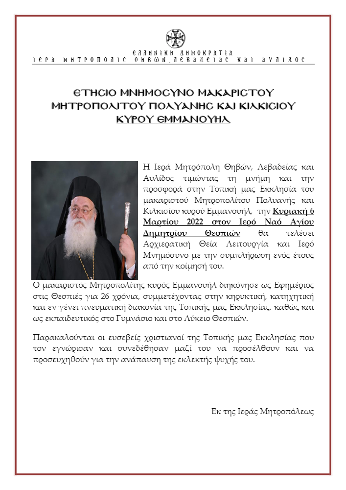 Η Ιερά Μητρόπολη Θηβών, Λεβαδείας και Αυλίδος τιμώντας την μνήμη και την προσφορά στην Τοπική Εκκλησία του μακαριστού Μητροπολίτη Πολυανής και Κιλκισίου κυρού Εμμανουήλ, την Κυριακή 6 Μαρτίου 2022 στον Ιερό Ναό Αγίου Δημητρίου Θεσπιών θα τελέσει αρχιερατική θεία λειτουργία και ιερό μνημόσυνο ε την συμπλήρωση ενός έτους από την κοίμησή του.