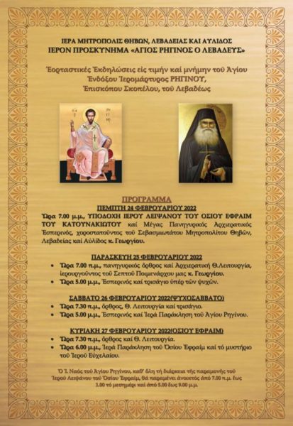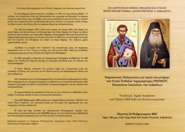 Με την υποδοχή του Ιερού Λειψάνου του Οσίου Εφραίμ του Κατουνακιώτη και εν συνεχεία τον Μέγα πανηγυρικό Αρχιερατικό Εσπερινό αρχίζουν την Πέμπτη οι εορταστικές εκδηλώσεις εις τιμήν και μνήμην του Αγίου Ενδόξου Ιερομάρτυρος Ρηγίνου, Επισκόπου Σκοπέλουκαι Λεβαδέως στην Ιερά Μητρόπολη Θηβών και Λεβαδείας.