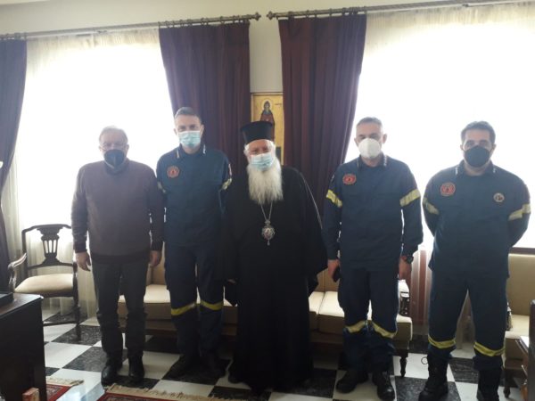 Ο Σεβασμιώτατος συνομίλησε με τους επισκέπτες για διάφορα τρέχοντα θέματα και ευχήθηκε στον νέο Διοικητή της Πυροσβεστικής καλή δύναμη στο έργο του.