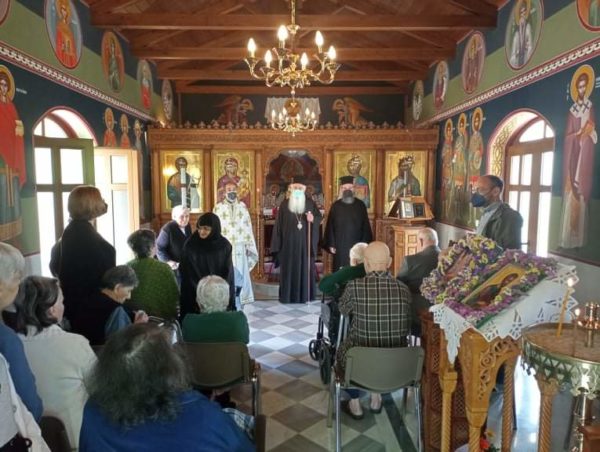 Κατόπιν, ο Σεβασμιώτατος επισκέφθηκε όλους τους φιλοξενούμενους στο Θεραπευτήριο, καθώς και τα παιδιά του Κέντρου “Ειδική Παιδεία”, τα οποία υποδέχτηκαν τον Σεβασμιώτατο τραγουδώντας.