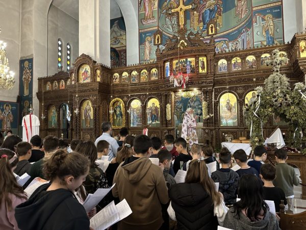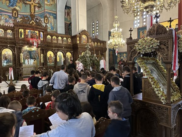 Όλοι οι μαθητές του Δημοτικού συμμετείχαν και έψαλλαν με υποδειγματική τάξη και ησυχία και υπό την διεύθυνση του Καθηγητή Μουσικής του Σχολείου κ. Κυριάκου Στάντζου. Σε όλη τη διάρκεια της Θείας Λειτουργίας ο Σεβασμιώτατος εξηγούσε στα παιδιά τα τελούμενα.