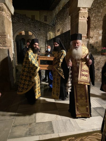 Χωρίς τη συμμετοχή των πιστών εορτάστηκε φέτος στην Ιερά Μονή του Οσίου Λουκά η επανακομιδή των ιερών λειψάνων του Οσίου και Θεοφόρου Λουκά, λόγω των μέτρων προστασίας από την πανδημία. Το Σάββατο 12 και την Κυριακή 13 Δεκεμβρίου στον Ιερό Ναό της Παναγίας, στο κέντρο του οποίου είχαν μεταφερθεί τα ιερά λείψανα του Οσίου από το Καθολικό, τελέστηκε ο πανηγυρικός Εσπερινός και η πανηγυρική Θεία Λειτουργία από τον Σεβασμιώτατο Μητροπολίτη Θηβών και Λεβαδείας κ. Γεώργιο, πλαισιωμένο από τον Ηγούμενο και τους μοναχούς της Μονής.