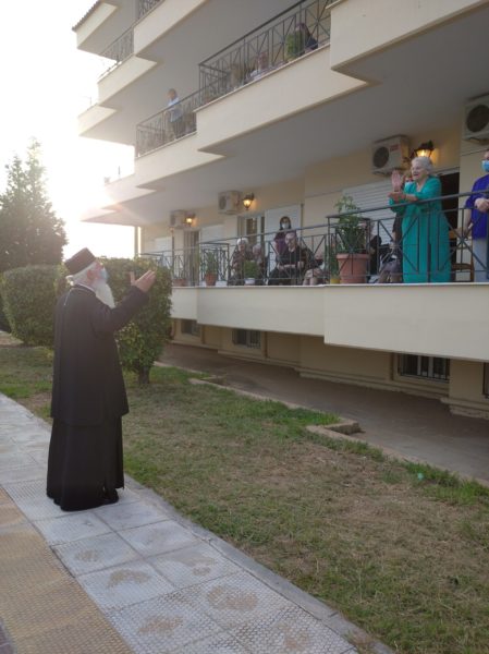 Την εκδήλωση παρακολούθησαν οι φιλοξενούμενοι της Ενοριακής Στέγης από τις βεράντες των δωματίων τους, λόγω των μέτρων προστασίας από τον κορωνοϊό.