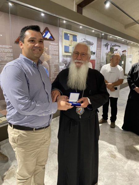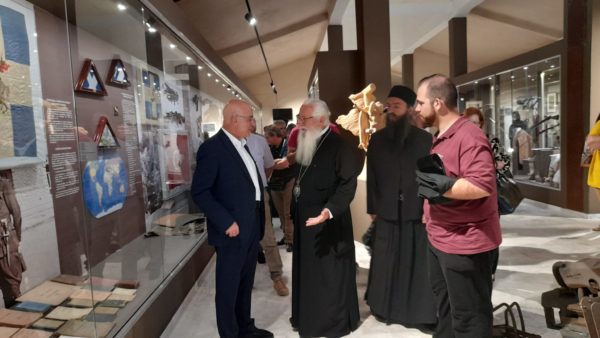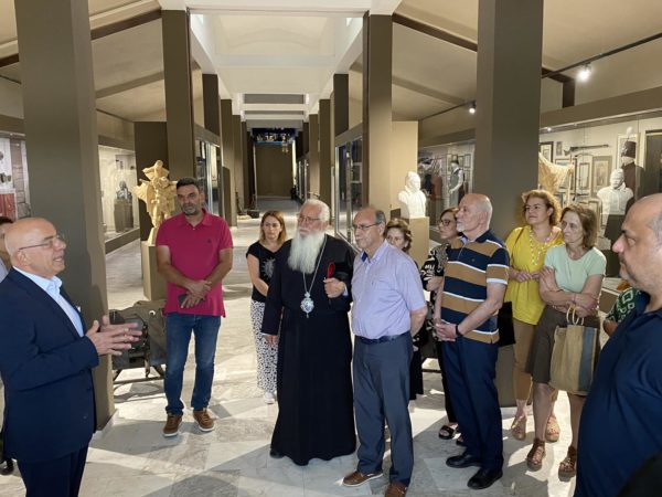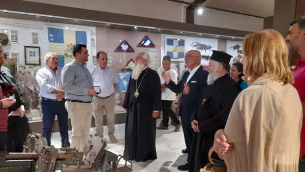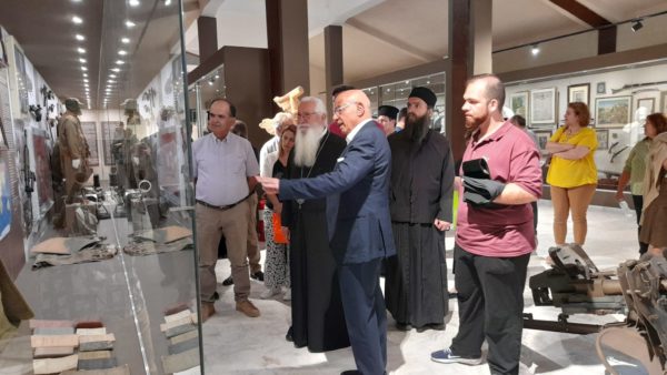 Η επίσκεψη ξεκίνησε από το Πολεμικό Μουσείο Χαλκίδας, όπου υποδέχτηκαν τον Σεβασμιώτατο και τους συνεργάτες του ο Διοικητής του Μουσείου Ταγματάρχης κ. Χαράλαμπος Λέων και ο κ. Αναστάσιος Λιάσκος, πρώην Υφυπουργός Τουριστικής Ανάπτυξης, ο οποίος έχει δωρίσει την προσωπική συλλογή του στο Μουσείο, και ο οποίος πραγματοποίησε την ξενάγηση παρουσιάζοντας αναλυτικά τα μοναδικά και σπάνια ιστορικά κειμήλια από την Eνετοκρατία και την Επανάσταση του 1821 έως τη σύγχρονη ιστορία. Ο Σεβασμιώτατος Ποιμενάρχης μας ευχαρίστησε τον κ. Λιάσκο για την εξαιρετική ξενάγηση, καθώς και τον Διοικητή του Μουσείου για τη φιλοξενία.