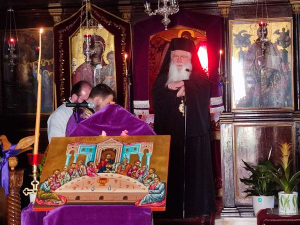 Ο Σεβασμιώτατος στο κήρυγμα προς τους πιστούς αναφέρθηκε στη σπουδαιότητα της Μεγάλης Πέμπτης και τα γεγονότα που προβάλλει η Εκκλησία αυτή την ημέρα, τον ιερό Νιπτήρα, την παράδοση από τον Χριστό του Μυστηρίου της Θείας Ευχαριστίας, την υπερφυά προσευχή του Χριστού στη Γεθσημανή και την προδοσία του Ιούδα.