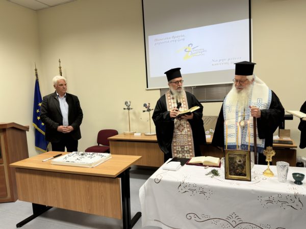 Ο Σεβασμιώτατος τέλεσε την ακολουθία του Αγιασμού και στη συνέχεια ευλόγησε τη Βασιλόπιτα του Σχολείου, παρουσία του Διευθυντή, των Εκπαιδευτών, των Εκπαιδευόμενων και της Δημοτικής Αρχής.