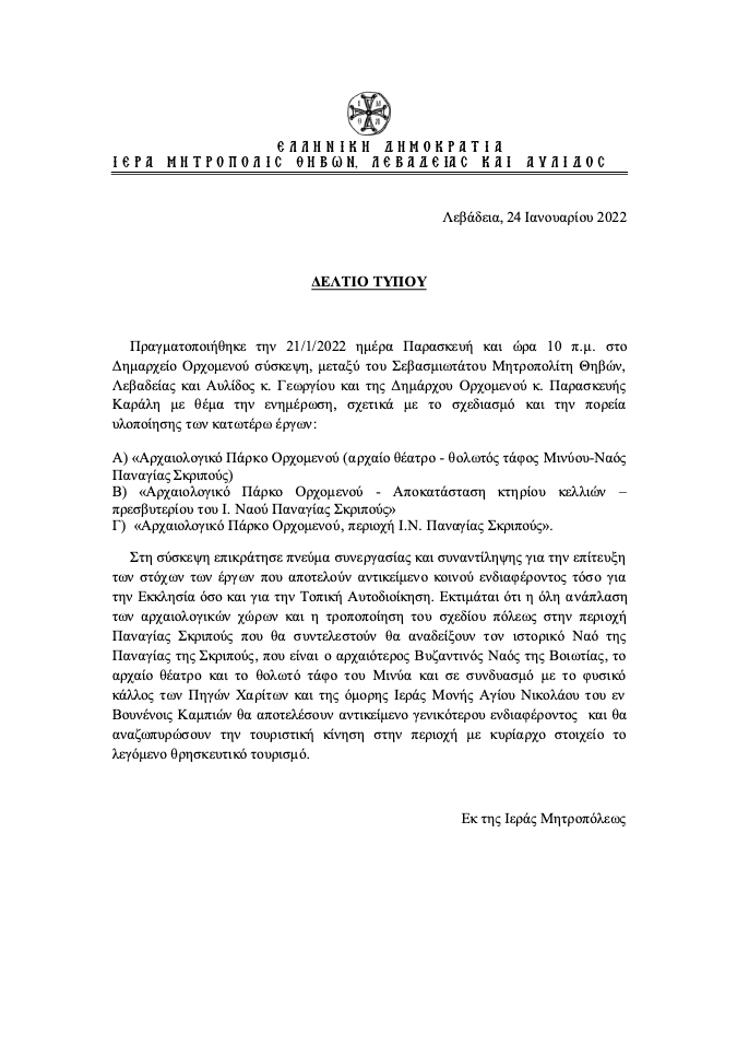 Σύσκεψη μεταξύ του Σεβασμιωτάτου Μητροπολίτη Θηβών, Λεβαδείας και Αυλίδος κ. Γεωργίου και της Δημάρχου Ορχομενού κ. Παρασκευής Καράλη πραγματοποιήθηκε στο Δημαρχείο Ορχομενού την Παρασκευή 21 Ιανουαρίου 2022, με θέμα την ενημέρωση αναφορικά με τον σχεδιασμό και την πορεία υλοποιήσης των έργων ανάπλασης των αρχαιολογικών χώρων στην περιοχή του Ιερού Ναού της Παναγίας Σκριπούς, του αρχαιοτέρου Ναού Βυζαντινού Ναού της Βοιωτίας.