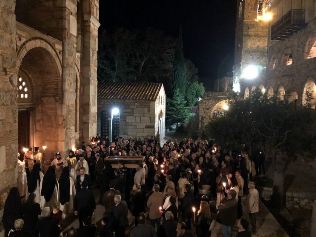 Στο αχνόφως του δειλινού, όπου το σκότος της νυκτός απλωνόταν σιγά-σιγά, τα αγιοκέρια και τα λαδοκάντηλα έδιναν το φως τους στους χρυσαφένιους κάμπους των ψηφιδωτών, που με τη σειρά τους ακτινοβολούσαν αναδεικνύοντας τις μορφές της Παναγίας, των αγγέλων, των αποστόλων, των προφητών και των αγίων· η θριαμβεύουσα Εκκλησία. Και κύκλῳ του ιερού σκηνώματος προσκυνούσα τιμητικά και ευλαβικά Αὐτῷ άπασα η στρατευομένη Εκκλησία, ο επίσκοπος, οι πρεσβύτεροι, οι διάκονοι και οι πιστοί προσευχόμενοι, ίνα ο Όσιος πρεσβεύῃ στον Κύριο και Θεό για όλους.