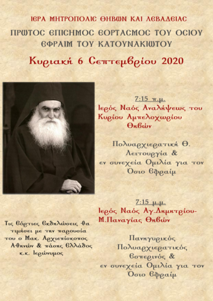 Τη χαρά της Ιεράς Μητροπόλεως Θηβών και Λεβαδείας για τον νεοκαταταχθέντα Άγιο Της, τον γόνο της Βοιωτικής Εκκλησίας που ασκήτεψε στο Άγιον Όρος, Όσιο Εφραίμ τον Κατουνακιώτη, εξέφρασε το Σάββατο ο Σεβασμιώτατος Μητροπολίτης κ. Γεώργιος από το Ιερό Παρεκκλήσιο του Τιμίου Προδρόμου στο χωριό Μάζι Αλιάρτου. Ο Σεβασμιώτατος ανακοίνωσε ότι η Τοπική Εκκλησία θα εορτάσει την Κυριακή 6 Σεπτεμβρίου επίσημα τον Όσιο Εφραίμ μετά την αγιοκατάταξή Του από το Οικουμενικό Πατριαρχείο, στην γενέτειρά του το Αμπελοχώρι Θηβών, καθώς και στην πόλη των Θηβών, όπου έζησε πριν πάει στο Αγιώνυμο Όρος.
