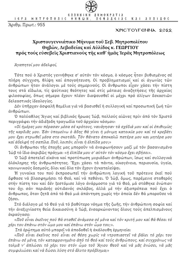 To Χριστουγεννιάτικο μήνυμα του Μητροπολίτη Θηβών