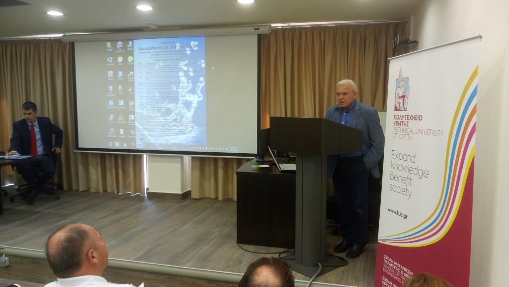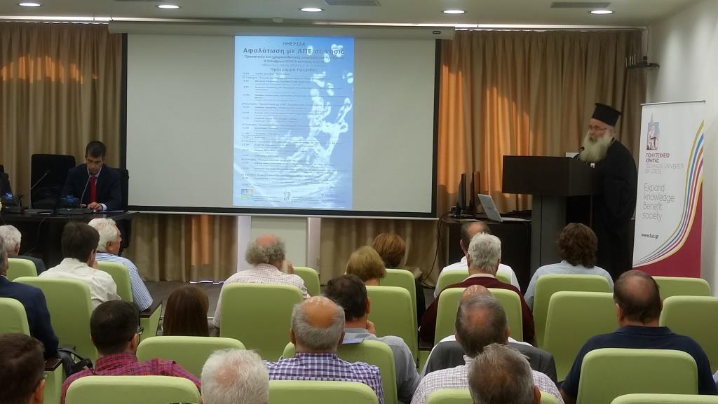 Με επιτυχία πραγματοποιήθηκε τη Δευτέρα 8 Οκτωβρίου στην κατάμεστη αίθουσα διαλέξεων του «Κέντρου Πολιτιστικής & Κοινωνικής Μέριμνας» της Ιεράς Μητροπόλεως Ιεραπύτνης και Σητείας η ημερίδα με θέμα «Αφαλάτωση με Ανανεώσιμες Πηγές Ενέργειας σε νησιά. Προοπτικές και χρηματοδοτικές ευκαιρίες για την Κρήτη», που διοργάνωσε ο Τ.Ο.Ε.Β. Ιεράπετρας σε συνεργασία με το Πολυτεχνείο Κρήτης.