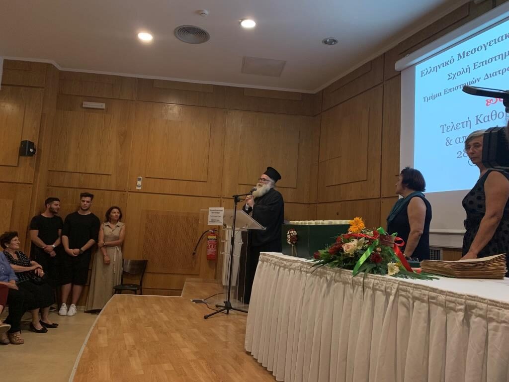 Ο Σεβ. Μητροπολίτης Ιεραπύτνης και Σητείας κ. Κύριλλος, κατά τον χαιρετισμό του, συνεχάρη εγκάρδια τους νέους αποφοίτους του Τμήματος Διατροφής και Διαιτολογίας και τους ευχήθηκε καλή σταδιοδρομία, υπογραμμίζοντας ότι, «ως Τοπική Εκκλησία, έμπρακτα στηρίζουμε τη λειτουργία του καταξιωμένου αυτού Τμήματος του Τ.Ε.Ι. και πλέον Ελληνικού Μεσογειακού Πανεπιστημίου Κρήτης».