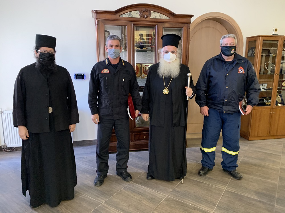 Ο νέος Διοικητής των Π. Υ. Λασιθίου, τον οποίο συνόδευε ο Διοικητής της Π.Υ. Ιεράπετρας κ. Δημήτριος Καλλιοντζής, ενημέρωσε τον Σεβασμιώτατο για το έργο της Πυροσβεστικής Υπηρεσίας, επισημαίνοντας ότι το Πυροσβεστικό Σώμα πάντοτε επιδιώκει τη συνεργασία καί την αρωγή της Εκκλησίας.