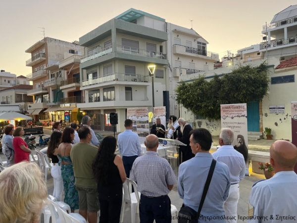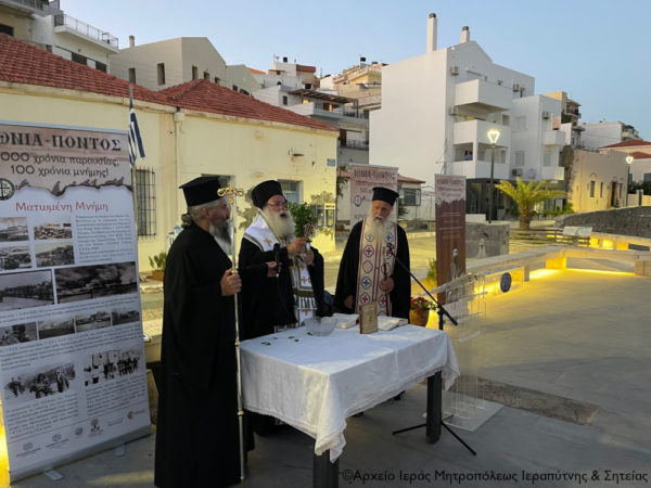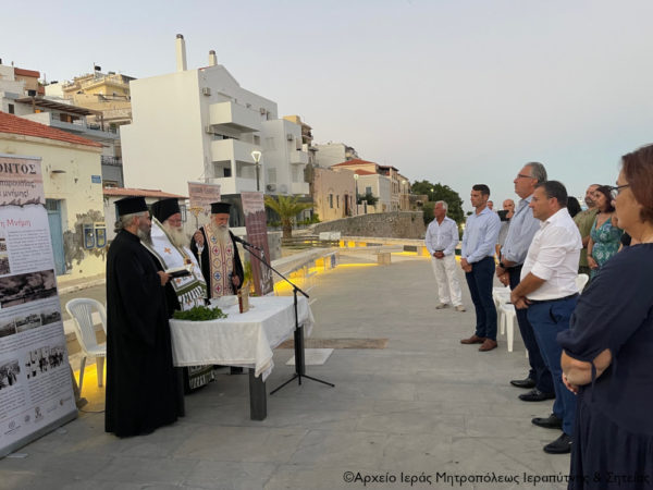 Στη συνέχεια, ο Σεβασμιώτατος και η συνοδεία του μετέβησαν πεζή στον χώρο μπροστά από το Τελωνείο Σητείας, όπου τέλεσε Αγιασμό για την ονοματοδοσία της Πλατείας Τελωνείου σε «Πλατεία Μικρασιατών», κατόπιν ενεργειών και πρωτοβουλίας του Συλλόγου Μικρασιατών Ποντίων και Αρμενίων Σητείας στο πλαίσιο των εκδηλώσεων μνήμης των Μικρασιατών της εκατονταετηρίδος (1922-2022).