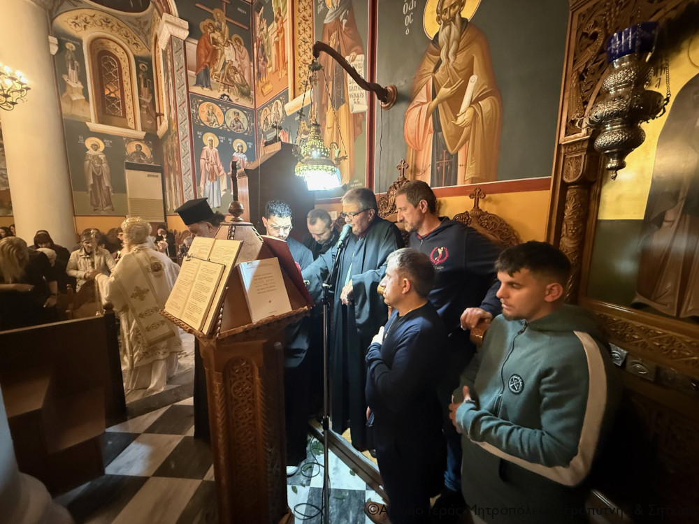 Πριν από τον Αρχιερατικό Εσπερινό, κατά την εκκλησιαστική τάξη, ο Σεβ. Μητροπολίτης κ. Κύριλλος ενδύθηκε άπασα την Αρχιερατική του στολή στο κέντρο του ναού, κάτω από τον πολυέλαιο, ενώ ο ιεροψαλτικός χορός έψαλε σε αργό μέλος το Δοξαστικό των Αίνων του Πάσχα «Αναστάσεως ημέρα…».