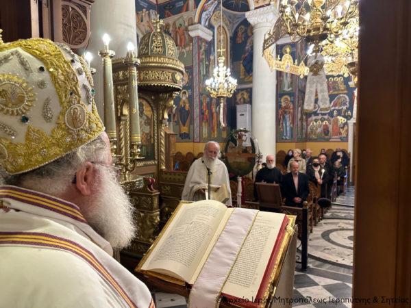 Ειδικότερα ο Μητροπολίτης ανέγνωσε το ιερό Ευαγγέλιο στην κοινή ελληνική γλώσσα από την Ωραία Πύλη, ακολούθως ανέγνωσε ο Αιδεσιμολ. Πρωτ. Φιλοκτήμων Αυγουστινάκης στη Λατινική γλώσσα, ο αριστερός ιεροψάλτης του ναού κ. Ανδρέας Παπαγγελόπουλος στη γαλλική και στη συνέχεια ο χορός των ιεροψαλτών υπό τον π. Νικόλαο απέδωσε αριστοτεχνικά το ευαγγελικό ανάγνωσμα στην ομηρική γλώσσα, ενώ τέλος ο Ιερολ. Διάκονος Θεμιστοκλής Μπεϊνάς ανέγνωσε και πάλι στην ελληνική από τον άμβωνα του ναού.