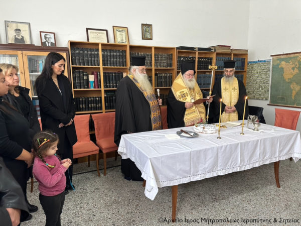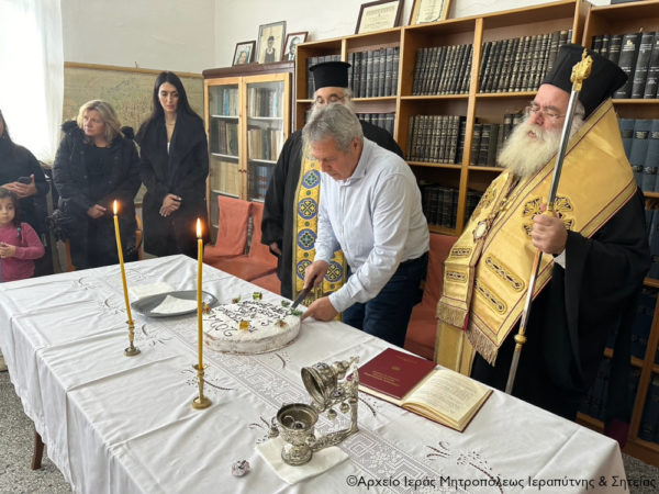Ο Μητροπολίτης Ιεραπύτνης και Σητείας κ. Κύριλλος ανταποκρινόμενος σε ευγενική πρόσκληση του Προέδρου και των Μελών του Δ.Σ. του Πολιτιστικού και Φιλοδασικού Συλλόγου Μεσελέρων, προσήλθε χθες στην αίθουσα του Συλλόγου στον χώρο της Ωλέριας Βιβλιοθήκης στο παλαιό Δημοτικό Σχολείο της Τοπικής Κοινότητας Μεσελέρων, ευλόγησε την Βασιλόπιτα και αντάλλαξε ευχές για τη νέα χρονιά.