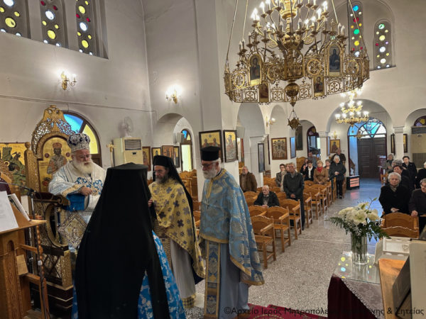 Στην Αρχιερατική Θεία Λειτουργία έλαβαν μέρος ο Πανοσιολ. Πρωτοσύγκελλος της Ι. Μητροπόλεως Αρχιμ. Αμβρόσιος Σκαρβέλης, ο Εφημέριος και προϊστάμενος του ναού Πανοσιολ. Αρχιμ. Φιλόθεος Δοργιάκης, ο συνταξιούχος Εφημέριος Πρωτ. Εμμανουήλ Μολυμπάκης και ο Διάκονος Θεμιστοκλής Μπεϊνάς.