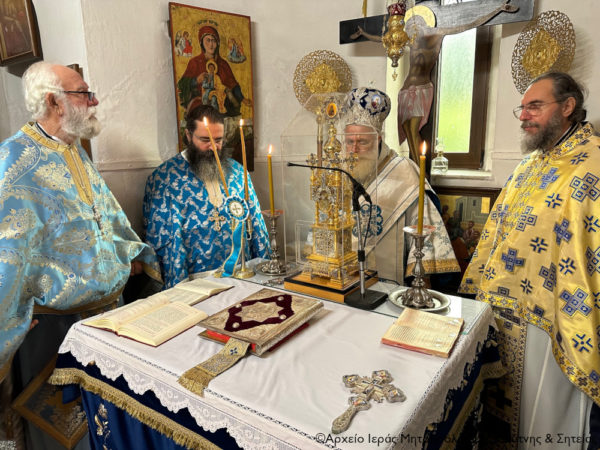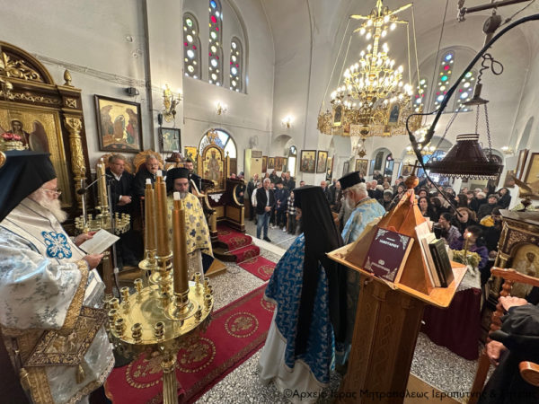 Στην Αρχιερατική Θεία Λειτουργία έλαβαν μέρος ο Πανοσιολ. Πρωτοσύγκελλος της Ι. Μητροπόλεως Αρχιμ. Αμβρόσιος Σκαρβέλης, ο Εφημέριος και προϊστάμενος του ναού Πανοσιολ. Αρχιμ. Φιλόθεος Δοργιάκης, ο συνταξιούχος Εφημέριος Πρωτ. Εμμανουήλ Μολυμπάκης και ο Διάκονος Θεμιστοκλής Μπεϊνάς.