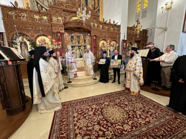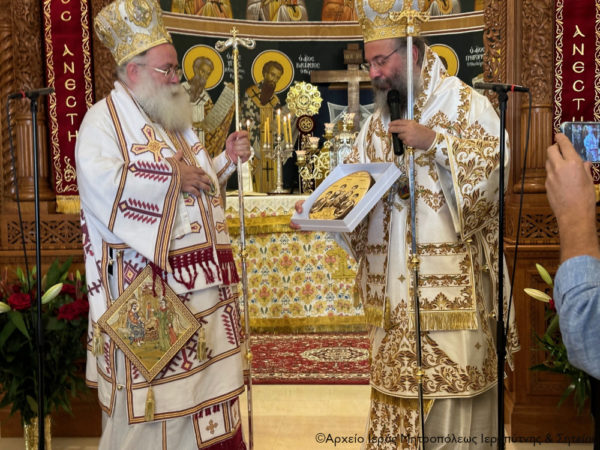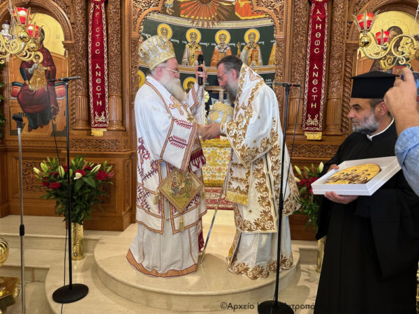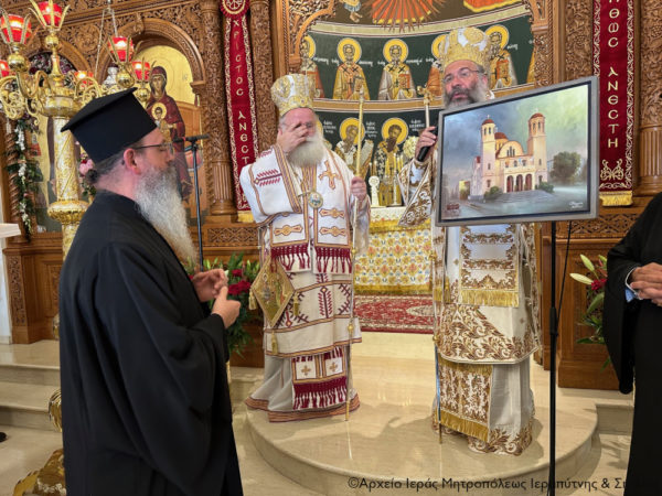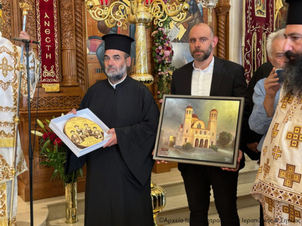 Τέλος πρόσφερε στον Σεβασμιώτατο Αδελφό του κ. Κύριλλο, «τον Δεσπότη που είναι ως ο διακονών» -όπως χαρακτηριστικά είπε- μια εικόνα από ξύλο ελιάς του Ρεθύμνου, ζωγραφισμένη από το Ρεθυμνιώτη παπαδογιό και υποψήφιο κληρικό Νικόλαο Ρουσάκη, με τον λογότυπο του επετειακού έτους για τα διακόσια χρόνια από το μαρτύριο των Αγίων Τεσσάρων Μαρτύρων (1824-2024), προκειμένου να κοσμεί το Επισκοπείο του, ενώ στον Πανοσιολ. Αρχιμ. Πορφύριο Αγγελάκη, προϊστάμενο του πανηγυρίζοντος ναού, επέδωσε ως ενθύμιο έναν πίνακα του Ιερού Καθεδρικού Ναού των Αγίων Τεσσάρων Μαρτύρων Ρεθύμνου, για τις πάντοτε ανοικτές αγκάλες του και την φιλοξενία του στον πανηγυρίζοντα ναό.