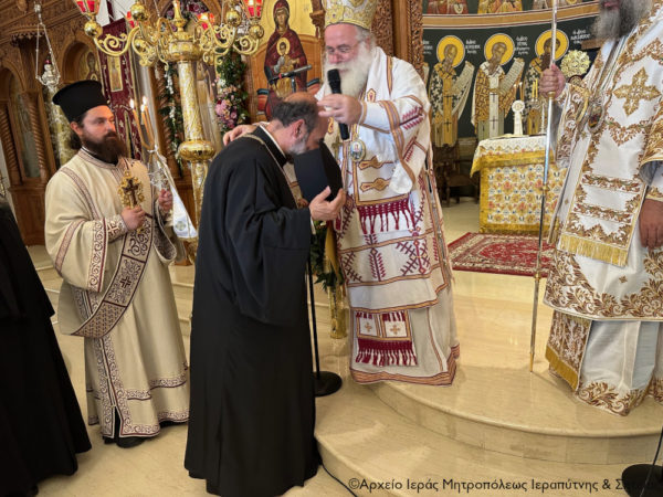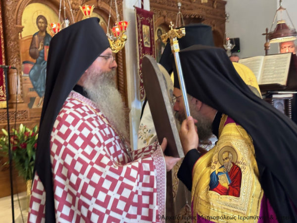 Ο Σεβασμιώτατος Μητροπολίτης Ιεραπύτνης και Σητείας κ. Κύριλλος πρόσφερε στον Σεβασμιώτατο Μητροπολίτη Ρεθύμνης και Αυλοποτάμου κ. Πρόδρομο ένα Αρχιερατικό Εγκόλπιο με την εικόνα του Αρχιποίμενος Χριστού για να ενθυμάται την παρουσία του στην Ιεράπετρα, και στον συνοδό του κληρικό Αιδεσ. Πρωτ. Δημήτριο Τσακπίνη, ο οποίος είχε έλθει στην Ιεράπετρα ως Διάκονος του αοιδίμου Μητροπολίτου κυρού Ανθίμου, ένα επιστήθο σταυρό ως ενθύμιο.