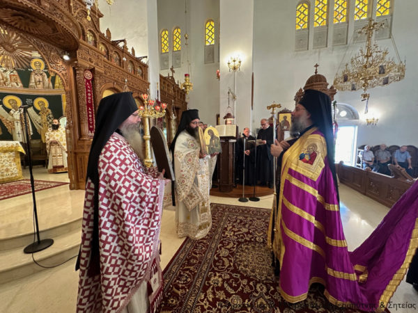 Πριν την Απόλυση ο Σεβασμιώτατος Μητροπολίτης Ιεραπύτνης και Σητείας κ. Κύριλλος ευχαρίστησε από καρδίας τον Σεβασμιώτατο Μητροπολίτη Ρεθύμνης και Αυλοποτάμου κ. Πρόδρομο, ο οποίος «όδευσε οδόν μακράν» για να κομίσει στον πανηγυρίζοντα Ιερό Καθεδρικό Ναό Αγίας Φωτεινής Ιεράπετρας τις Τίμιες Καρών των Αγίων Τεσσάρων Νεομαρτύρων των εν Ρεθύμνη μαρτυρησάντων Γεωργίου, Αγγελή, Μανουήλ και Νικολάου.
