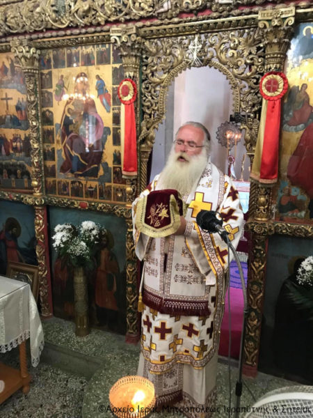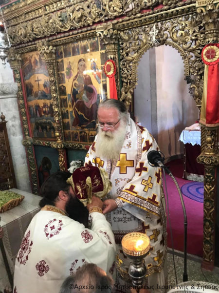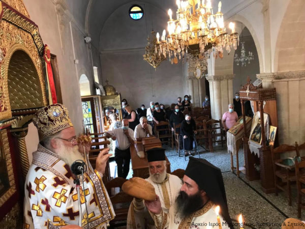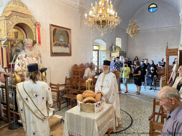 Ο Σεβασμιώτατος Μητροπολίτης Ιεραπύτνης και Σητείας κ. Kύριλλος χοροστάτησε κατά την ακολουθία του Όρθρου, ευλόγησε τους προσφερόμενους άρτους και στη συνέχεια τέλεσε τη Θεία Λειτουργία, κήρυξε τον Θείο Λόγο και κατά το εκκλησιαστικό έθος, μετά την Οπισθάμβωνο Ευχή, ευλόγησε τα πρώτα σταφύλια.