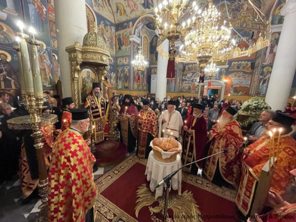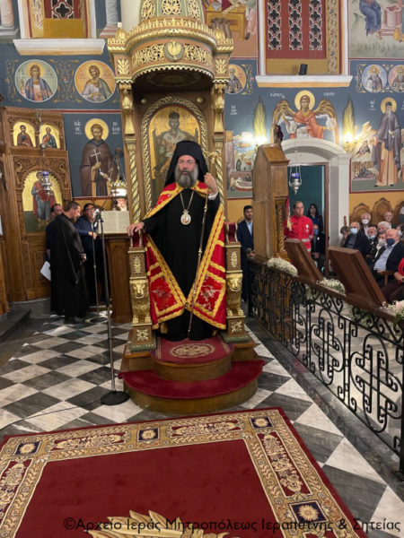 Ο Σεβασμιώτατος κ. Πρόδρομος ευχαρίστησε τον Μητροπολίτη κ. Κύριλλο για την πρόσκληση και την αδελφική συμπόρευση τόσα χρόνια στην Αρχιγραμματεία της Ιεράς Επαρχιακής Συνόδου και με λόγο μεστό, γλαφυρό και ζωντανό αναφέρθηκε στα πολλά χαρίσματα, στην σταθερή πίστη προς τον Νυμφίο Χριστό και στο μαρτύριο της Αγίας Αικατερίνης. Μάλιστα, τόνισε ότι η μνήμη της συμπίπτει με την απόδοση της εορτής των Εισοδίων της Παναγίας κάνοντας λόγο για εισόδια και εξόδια της Αγίας. Εάν η Αγία δεν παρέμενε πιστή, αφοσιωμένη και όρθια στην πίστη προς τον Χριστό δεν θα εισόδευε στην Ουράνια Βασιλεία, κατά την μαρτυρική έξοδό της από αυτόν τον πρόσκαιρο κόσμο. Και αυτό είναι το μήνυμα της εορτής, όπως σημείωσε, να παραμείνουμε όρθιοι και να μην λυγίζουμε ποτέ, όσες μπόρες και αν έρθουν, όσες δυσκολίες, όσες πλημμύρες. Αλλά να στεκόμαστε στα πόδια μας, όπως η μεγαλομάρτυς νύμφη του Χριστού και να γονατίζουμε μόνο μπροστά στον Παντοδύναμο Θεό. Τέλος, ευχήθηκε σε όλο το εκκλησίασμα χρόνια πολλά και ευλογημένα και οι πρεσβείες της Αγίας Μεγαλομάρτυρος Αικατερίνης να τους συνοδεύουν.