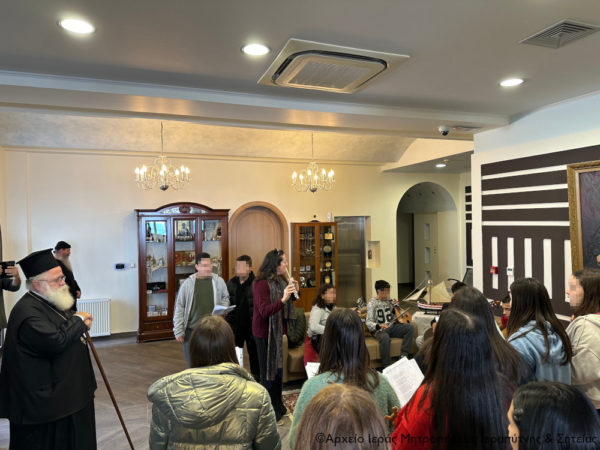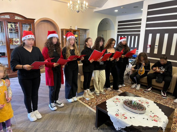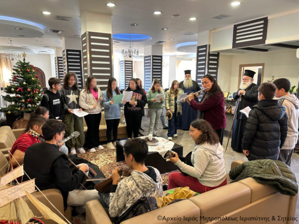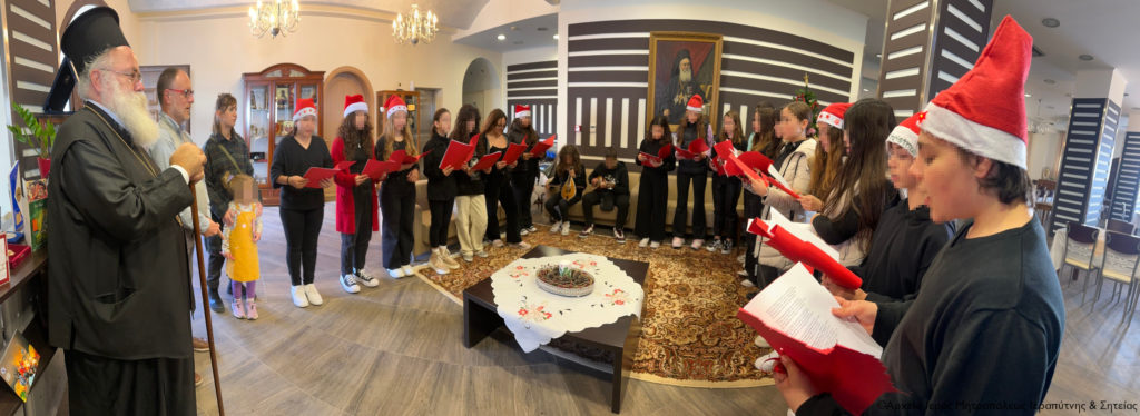 Αρχικά ο Σεβασμιώτατος κ. Κύριλλος υποδέχθηκε στο γραφείο του ομάδα μαθητών του 1ου Γυμνασίου Ιεράπετρας, οι οποίοι έψαλαν τα κάλαντα των Χριστουγέννων από διάφορες περιοχές της πατρίδας μας. Τους συνόδευαν ο Διευθυντής κ. Φιλοκτήτης Τζαράκης και η καθηγήτρια Μουσικής κ. Άρτεμις Χαραλαμπάκη.