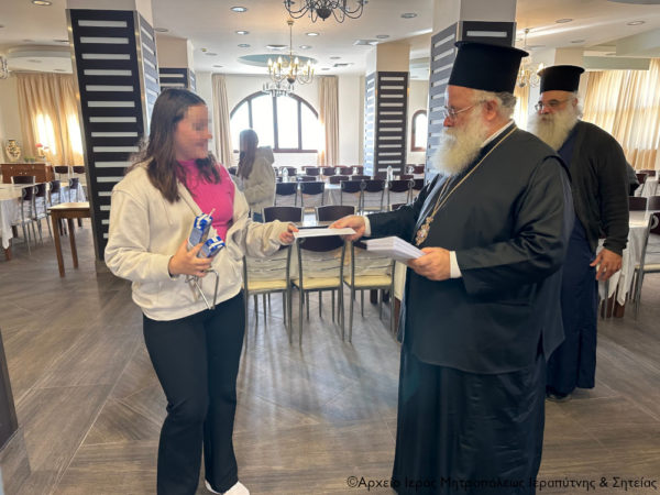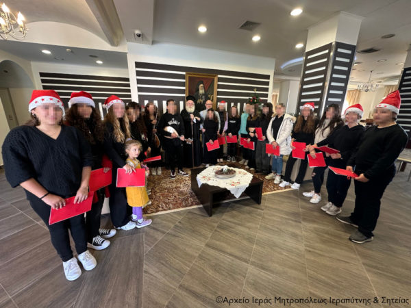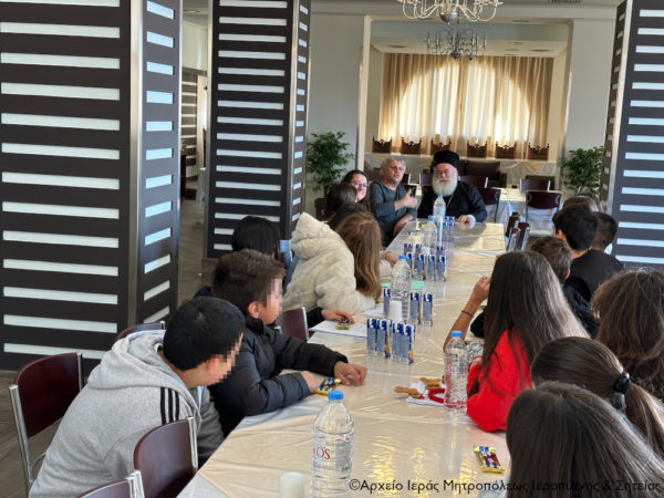 Μετά το καθιερωμένο κέρασμα, ο Σεβασμιώτατος συνομίλησε με τους μαθητές και τους συνοδούς τους, τους ευχήθηκε εγκάρδια καλά Χριστούγεννα και τους έδωσε την ευχητήρια κάρτα του για τις εορτές του αγίου Δωδεκαημέρου.