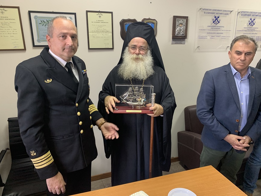 Ο Σεβασμιώτατος, ευχαρίστησε τον Λιμενάρχη κ. Ιωάννη Παπαδάκη για την ευγενή πρόσκληση και αντάλλαξε ευχές με όλους τους Λιμενικούς, ευχόμενος σε όλους και όλες που υπηρετούν στο Λιμεναρχείο χρόνια πολλά και καλή δύναμη στο έργο τους για τη θαλάσσια ασφάλεια, έχοντας τη βοήθεια του Θεού και τις πρεσβείες του Αγίου Νικολάου. Ο Θεός σας έταξε να υπηρετείτε σε μία πολλή ευαίσθητη για την πατρίδα μας περιοχή. Ευχή και καθημερινή προσευχή μας είναι ο Θεός να σας ενδυναμώνει και να σας χαρίζει κουράγιο και φώτιση για να συνεχίσετε να ανταπεξέρχεσθε με το ίδιο σθένος, με τον ίδιο ζήλο και με την ίδια υποδειγματική αφοσίωση στην φρούρηση των θαλασσίων συνόρων μας, σε καιρούς ιδιαιτέρως δύκολους και χαλεπούς για το Έθνος μας. Σας ευχαριστούμε γιαυτό. Η Τοπική Εκκλησία μας και εγώ προσωπικά θα συνεχίσουμε να είμαστε αρωγοί σε κάθε προσπάθειά σας, τόνισε ο Σεβ. Κύριλλος.
