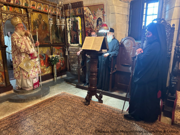 Στην Αρχιερατική Θεία Λειτουργία έλαβαν μέρος ο Ηγούμενος της Ι. Μονής Παναγίας Φανερωμένης Ιεράπετρας Αρχιμ. Παΐσιος Δερμιτζάκης, ο Παν/τος Προηγούμενος της Ι. Μονής Τοπλού Αρχιμ. Φιλόθεος Σπανουδάκης, ο Πανοσιολ. Αρχιμ. Πορφύριος Αγγελάκης, Εφημέριος της Ενορίας Ι. Κ. Ναού Αγίας Φωτεινής πόλεως Ιεράπετρας και Μέλος του Ηγουμενοσυμβουλίου της Μονής, ο Αιδεσ. Πρωτ. Γεώργιος Τσικαλάκης, συνταξ. Εφημέριος της Ενορίας Έξω Μουλιανών, ο Αιδεσιμολ. Πρωτ. Φιλοκτήμων Αυγουστινάκης, Εφημέριος της Ενορίας Ευαγγελισμού Θεοτόκου πόλεως Σητείας, ο Αιδεσ. Πρωτ. Σάββας Λιναρδάκης, Εφημέριος της Ενορίας Παναγίας Ελεούσας Ιεράπετρας, ο Αιδεσ. Πρωτ. Νικόλαος Παθιάκης, Εφημέριος της Ενορίας του Ι. Κ. Ναού Αγίας Αικατερίνης πόλεως Σητείας, ο Αιδεσ. Οικονόμος Ελευθέριος Δαργάκης, Εφημέριος της Ενορίας Μύρτου, και ο Ιερολ. Διάκονος Θεμιστοκλής Μπεϊνάς, ενώ κατά αρχαία παράδοση ο Ηγούμενος της Μονής Αρχιμ. Αμβρόσιος Σκαρβέλης παρέστη συμπροσευχόμενος από το Παραθρόνιο και μετά την Απόλυση διένειμε το αντίδωρο.