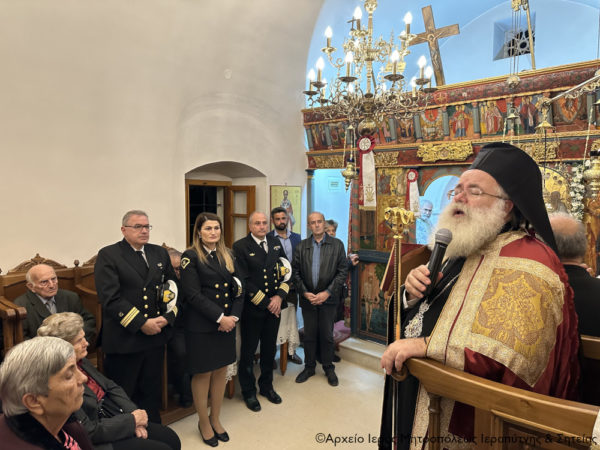 Υπογράμμισε ακόμα ότι ο άγιος Νικόλαος είναι ο άγρυπνος προστάτης των Ναυτικών, των Λιμενικών, των ψαράδων και όλων των θαλασσινών και όσων ταξιδεύουν στη θάλασσα, οι οποίοι επικαλούνται το όνομα του αγίου Νικολάου σε κάθε τρικυμία, γι᾽ αυτό και οι προπάτορές μας ανήγειραν τον πανηγυρίζοντα ναό κατά την Ενετοκρατία, προς τιμήν του.