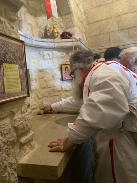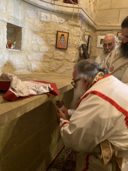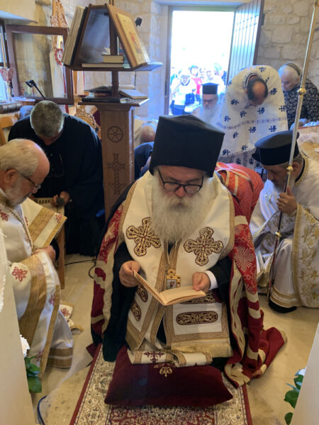 Ο Σεβ. κ. Κύριλλος, που επρόκειτο να τοποθετηθούν στο εσωτερικό της Αγίας Τραπέζης, χοροστάτησε στην ακολουθία του Όρθρου και ακολούθως τέλεσε την ακολουθία των Ιερών Εγκαινίων και προεξήρχε της Θείας Λειτουργίας. Τα Ιερά Λείψανα των Αγίων Τεσσάρων Μαρτύρων των εν Ρεθύμνη μαρτυρησάντων και των οσιομαρτύρων των εν τη Μονή του Αγίου Σάββα και εν Σινά και Ραϊθώ αναραιθέντων λιτανεύθηκαν εν πομπή πέριξ του Ιερού Ναού τρεις φορές. Μετά την είσοδο στον ναό τα ιερά λείψανα τοποθετήθηκαν κατά την τάξη στο φυτό της Αγίας Τραπέζηςφθηκαν με κηρομαστίχη. Ακολούθησε η πλύση της Αγίας Τράπεζας, η χρίση της με Άγιο Μύρο και κατόπιν στις τέσσερις γωνίες της Αγίας Τράπεζας με κηρομαστίχη επικολλήθηκαν μικρά υφάσματα που εικονίζουν τους τέσσερις Ευαγγελιστές. Στη συνέχεια καλύφθηκε η Αγία Τράπεζα και ενδύθηκε με καινούργια καλύμματα. Ακολούθως ο Σεβ. κ. Κύριλλος έλαβε τον κάλαμο με τον σπόγγο εμβαπτισμένο στο Άγιο Μύρο και στην κηρομαστίχη, με το οποίο έχρισε τους τοίχους του ναού σχηματίζοντας το μονόγραμμα του Ι. Χριστού, και στη συνέχεια εισήλθε στο Ιερό Βήμα, όπου άναψε την κανδήλα και τα κεριά της Αγίας Τραπέζης. Ακολούθησε η πρώτη Θεία Λειτουργία στην εγκαινιασθείσα Αγία Τράπεζα.