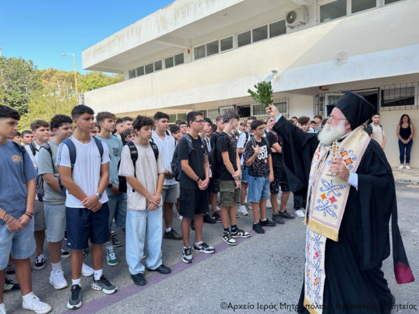 Στη συνέχεια ο Σεβ. Μητροπολίτης κ. Κύριλλος μετέβη στα δύο Γυμνάσια της πόλεως, όπου τέλεσε τον Αγιασμό και ανέγνωσε το μήνυμά του για την έναρξη της νέας σχολικής περιόδου στο κοινό προαύλιο των δύο σχολείων. Μεταξύ άλλων στο μήνυμά του προς τους μαθητές και τις μαθήτριες, ο Σεβασμιώτατος τόνισε ότι: «Ο ιερός αυτός χώρος της μάθησης και της παιδείας δεν περιορίζεται μόνο στη μετάδοση γνώσεων και πληροφοριών, αλλά σκοπεύει στην πνευματική και ψυχική καλλιέργεια και ανάπτυξη, στη συνολική διαμόρφωση και την ωρίμανση της προσωπικότητας σας. Το σχολείο είναι το δεύτερο σπίτι σας, είναι χώρος συνύπαρξης και επικοινωνίας, όπου δεν έχουν θέση καμία μορφής βία η εκφοβισμός. Σας ενώνει δυνατά μεταξύ σας με την ανάπτυξη του κοινοτικού πνεύματος και την καλλιέργεια υγιών, διαπροσωπικών σχέσεων αρμονικής συνύπαρξης, συνέργειας, ανεκτικότητας και αμοιβαίου σεβασμού μεταξύ όλων των μελών της σχολικής κοινότητας. […] Η Εκκλησία μας προσεύχεται για όλους σας, τους εκπαιδευτικούς, τους γονείς, και ιδιαίτερα για εσάς τους μαθητές και τις μαθήτριες, προκειμένου να προσλάβετε όλα όσα σας προσφέρει το σχολείο για να γίνετε ελεύθεροι και δημιουργικοί άνθρωποι. Σας προτρέπω, λοιπόν, να ξεκινήσετε τη νέα χρονιά με μεγάλο ενδιαφέρον, προθυμία και δίψα για μάθηση, προκειμένου να αξιοποιήσετε κάθε στιγμή της σχολικής σας ζωής, που σας προετοιμάζει για την υπόλοιπη ζωή σας».
