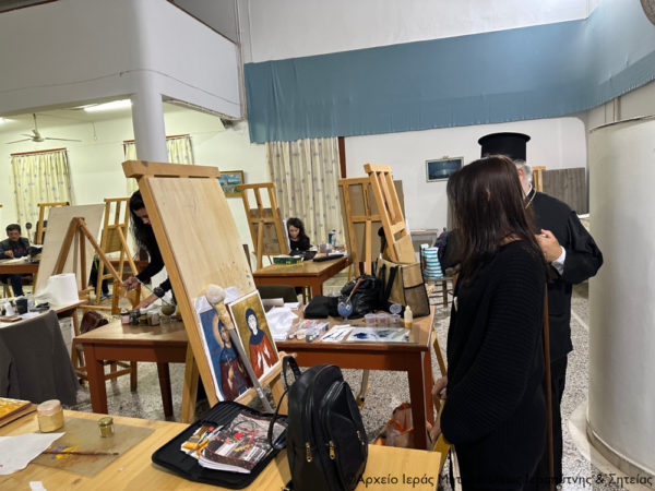 Τον Σεβασμιώτατο υποδέχθηκε και καλοσώρισε ο υπεύθυνος Δάσκαλος Αγιογραφίας και Ψηφιδωτού κ. Νικόλαος Γρινιεζάκης, ο οποίος παρουσίασε τους μαθητές και τα έργα τους.