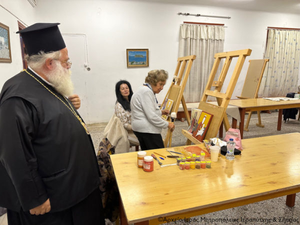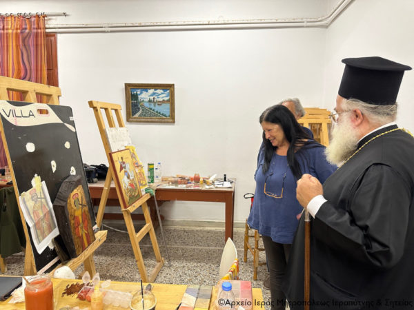 Ο Σεβασμιώτατος συνομίλησε με όλους τους μαθητές, είδε από κοντά τα έργα που φιλοτεχνούν και τους συνεχάρη για την πρόοδό τους, ενώ τους πρόσφερε ως ευλογία από ένα άλμπουμ με 24 φορητές εικόνες, που φυλάσσονται σε διάφορες Μονές και Ναούς της Μητροπόλεως.