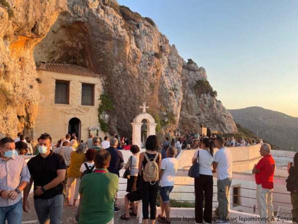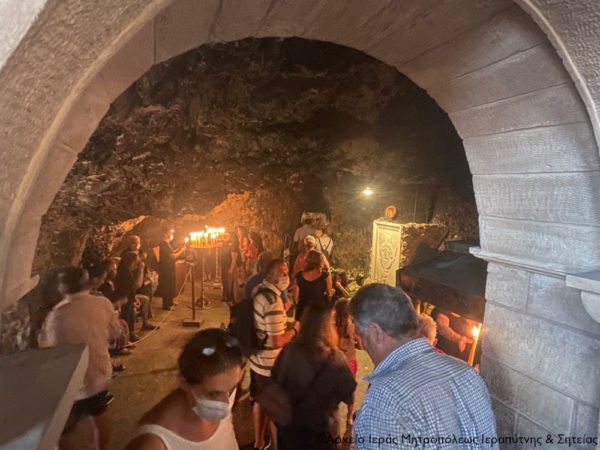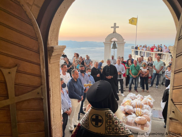 Πριν την Απόλυση ευλόγησε τους προσφερόμενους άρτους στον αύλειο χώρο του Καθολικού και μίλησε στους πολυπληθείς προσκυνητές για την μεγάλη εορτή της Κοιμήσεως της Παναγίας, για το ιερό της πρόσωπο αλλά και για την ιερή σχέση που έχουν οι Λασιθιώτες με την Παναγία την Φανερωμένη. Η μεγάλη Μάνα όλων μας, η Κυρία η Φανερωμένη, ανέφερε ο μεταξύ άλλων ο Σεβασμιώτατος, στέκεται στον ιερό βράχο της ακοίμητος φρουρός και συμπαραστάτης όλων μας καθόλη τη διάρκεια του χρόνου, ιδιαιτέρως όμως αυτές τις άγιες μέρες του Δεκαπενταυγούστου, του Πάσχα του καλοκαιριού, όπως το ονομάζει ο Θεοτοκόφιλος λαός μας. Εκείνη είναι ο αποδέκτης των αιτημάτων μας, ο φίλος μας, η παρηγοριά και η απαντοχή μας. Είναι η ακαταίσχυντη ελπίδα όλων μας, γιατί παρόλο που μετέστη στους ουρανούς, εντούτοις δεν εγκατέλειψε τη γη. Είναι δίπλα σε κάθε πόνο, σε κάθε δυσκολία, σε κάθε περίσταση και πρόβλημά μας. Είναι ο συγκυρηναίος μας για να σηκώσουμε αγόγγυστα τον σταυρό μας.
