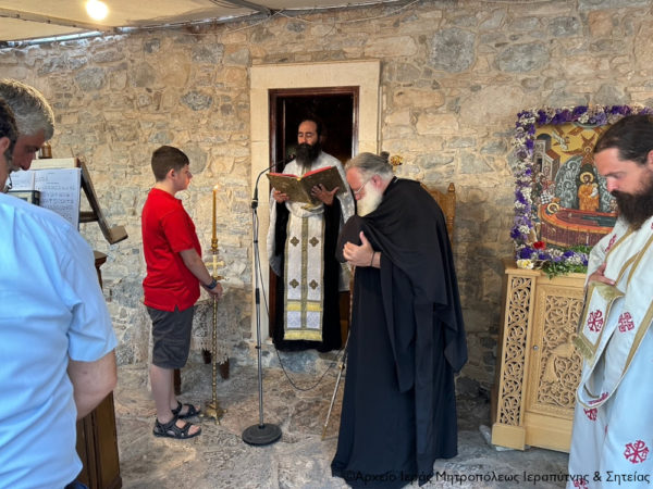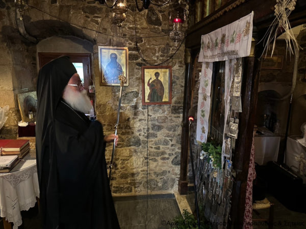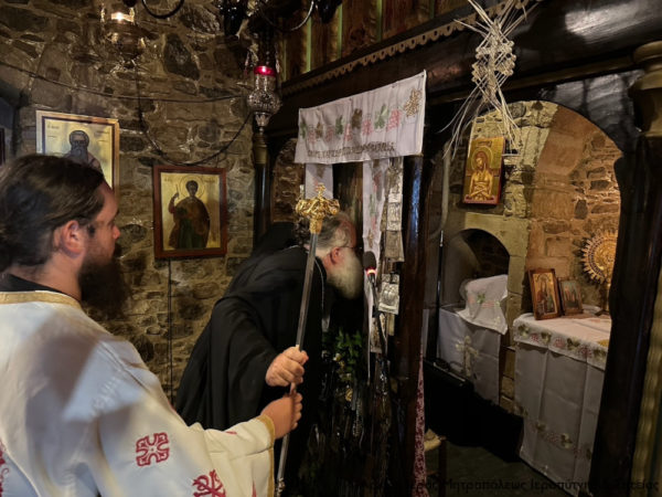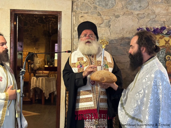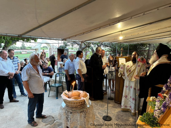 Η ακολουθία τελέσθηκε στον δενδρόφυτο και γεμάτο βασιλικούς αύλειο χώρο του ναού, όπου στο τέλος ο Σεβασμιώτατος ευλόγησε τους προσφερόμενους άρτους και κήρυξε κατάλληλα τον θείο λόγο στο εκκλησίασμα για το ιερό πρόσωπο της Θεομήτορος.
