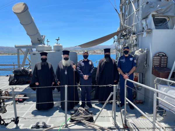Ο Σεβ., συνοδευόμενος από τον Πρωτοσύγκελλο της Μητροπόλεως και Ηγούμενο της Μονής Τοπλού Αρχιμ. Αμβρόσιο Σκαρβέλη και τον Αιδεσ. πρωτ. Νικόλαο Παθιάκη, ιερατικώς προϊστάμενο του Ι. Καθεδρικού Ναού Αγίας Αικατερίνης Σητείας, έγινε δεκτός εγκάρδια από τον Κυβερνήτη της Πυραυλάκατου Πλωτάρχη Αναστάσιο Λεονταράκη, τον Ύπαρχο και Μέλη του πληρώματος.
