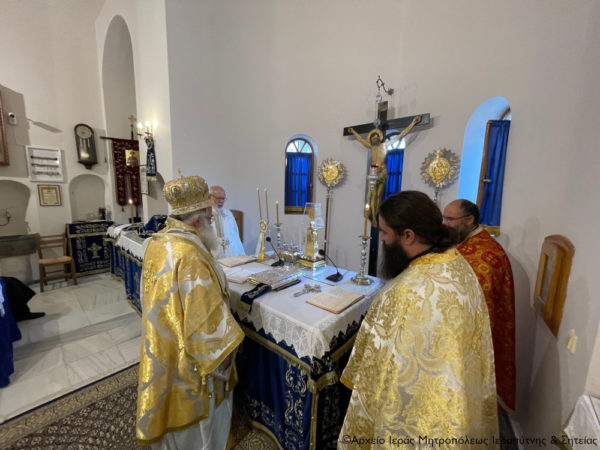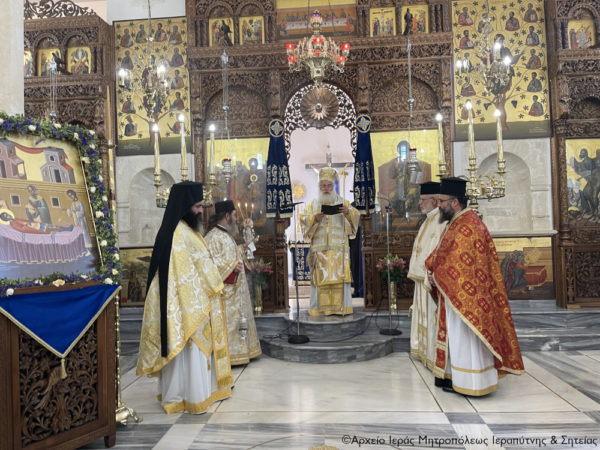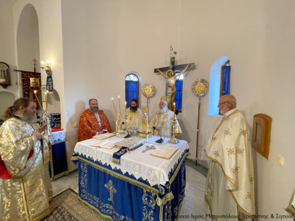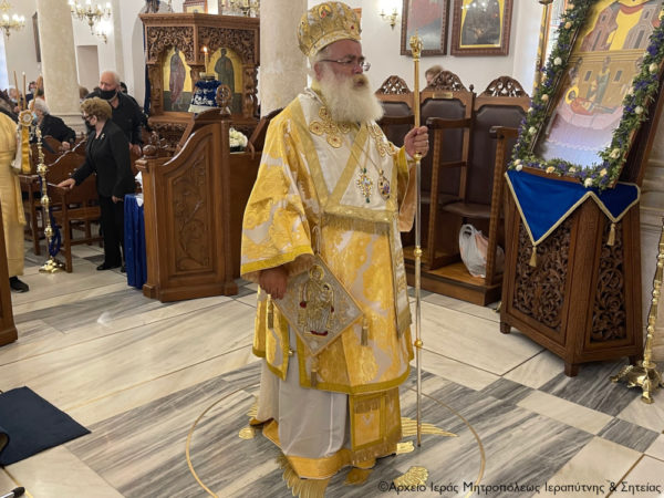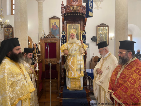 Πριν την Απόλυση τέλεσε τα ιερά μνημόσυνα των μακαριστών Νικολάου Ρουμελιωτάκη (σαρανταήμερο), Κωνσταντίνου Σακκαδάκη (τρίμηνο), Μαρίας Καλαϊτζάκη-Βαρτάνη (εξάμηνο) και Σταματίου Αρώνη (συναπάντημα). Στην αρχιερατική Θεία Λειτουργία έλαβαν μέρος ο πανοσιολ. Πρωτοσύγκελλος Αμβρόσιος Σκαρβέλης, ο συνταξ. Εφημέριος πρωτ. Μιχαήλ Ξυδιανός, ο προϊστάμενος του ναού πρωτ. Αθανάσιος Ταρλαντέζος και ο Διάκονος Τίτος Ματαλλιωτάκης, ενώ εκκλησιάστηκαν αρκετοί πιστοί, μεταξύ των οποίων και οι Αντιδήμαρχος κ. Μαρία Ρουμελιωτάκη και Κωνσταντίνος Αστροπεκάκης.