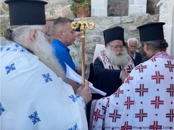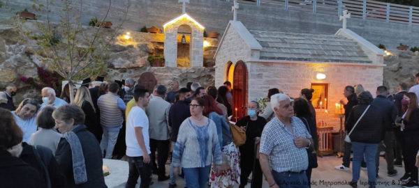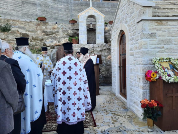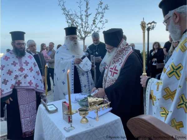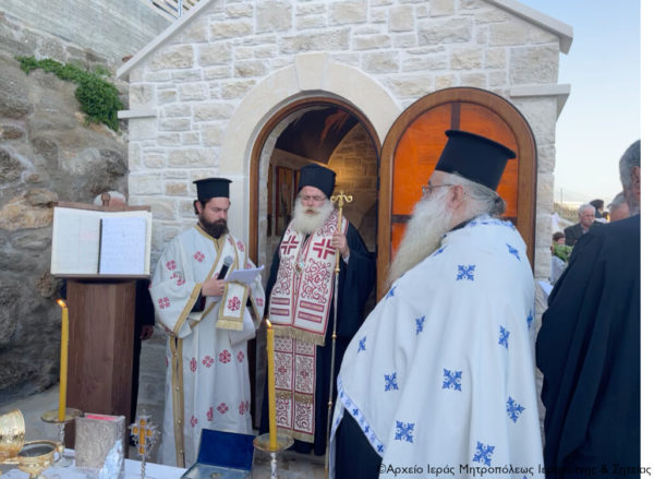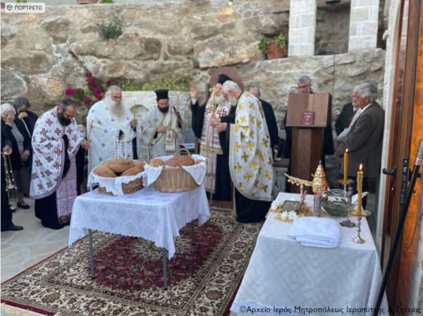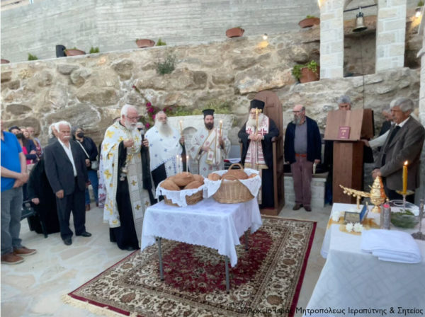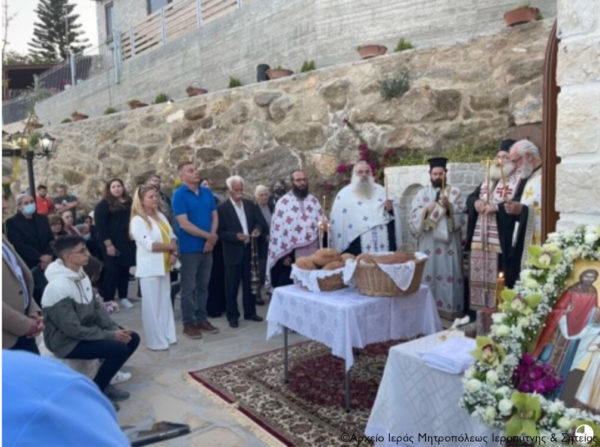 Ο Αγιασμός των Θυρανοιξίων τελέσθηκε στο προαύλιο του ναού, όπου ακολούθησε ο Αρχιερατικός πανηγυρικός Εσπερινός της εορτής της μνήμης των αγίων νεοφανών Μαρτύρων Ραφαήλ, Νικολάου και Ειρήνης, χοροστατούντος του Σεβασμιώτατου κ. Κυρίλλου, ο οποίος ευλόγησε τους άρτους και κήρυξε επίκαιρα τον θείο λόγο.
