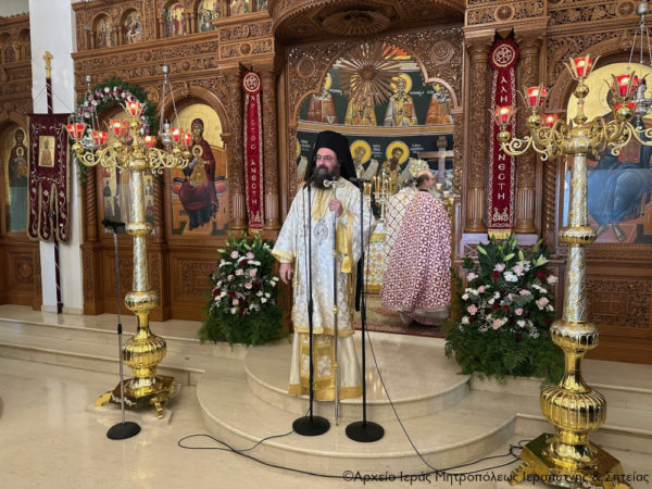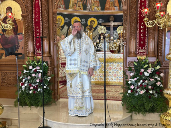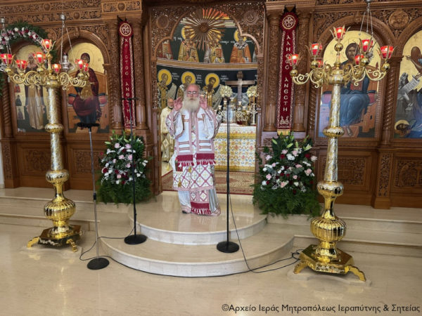 Με γλαφυρότητα και μεστό λόγο ο Σεβασμιώτατος αναφέρθηκε στις μεγάλες θεολογικές αλήθειες της Ευαγγελικής περικοπής της ημέρας από το κατά Ιωάννη Ευαγγέλιο (Ιω. 4, 5-42), όπου περιγράφεται η συνάντηση του Θεανθρώπου με τη Σαμαρείτιδα στη Συχάρ της Σαμάρειας. Αφού εξήγησε τους ιστορικούς λόγους της διαμάχης μεταξύ Ιουδαίων και Σαμαρειτών, που καθιστούσε παράδοξο γεγονός τον συγκεκριμένο διάλογο του Χριστού με τη Σαμαρείτισσα γυναίκα, εξήγησε ότι το «ύδωρ το ζων» είναι το Άγιο Πνεύμα που δροσίζει και ανακαινίζει τη ύπαρξή μας. Όπως υπογράμμισε, για να το λάβουμε τη Χάρη του Θεού και τη δρόσο του Αγίου Πνεύματος θα πρέπει πρώτα να καθαρίσουμε την δεξαμενή, τη στέρνα της ψυχής και της καρδιάς μας με τη μετάνοια. Ο Σεβασμιώτατος επεσήμανε ακόμα ότι ο Χριστός με τον αποκαλυπτικό διάλογο για την προσωπική της ζωή αλλά και για την «εν πνεύματι και αληθεία» προσκύνηση του Θεού βοήθησε τη μέχρι τότε αμαρτωλή γυναίκα και μετέπειτα Αγία Φωτεινή να μετανοήσει, γι’ αυτό αφήνει τη στάμνα της και σπεύδει να ανακοινώσει στην πόλη ότι γνώρισε τον Μεσσία. Ανακαινίζεται, βαπτίζεται, κηρύττει τον αληθινό Θεό και θα μαρτυρήσει για τον Χριστό μαζί με τις τέσσερις αδελφές της, Φωφώ, Φωτίδα, Παρασκευή και τους δύο γιούς της, Βίκτωρα και Ιωσή.