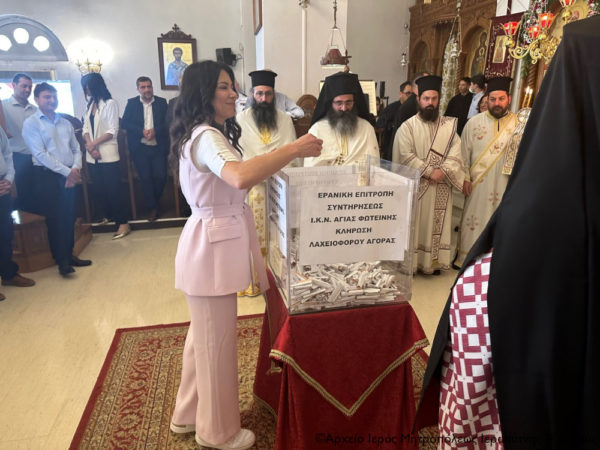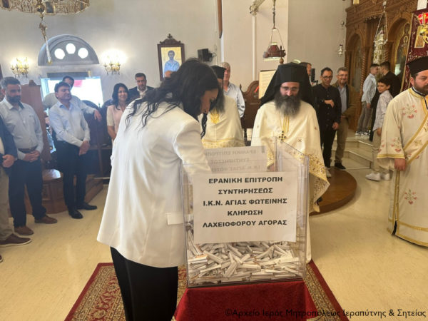 Τέλος, ακολούθησε η κλήρωση για τη διενεργηθείσα λαχειοφόρο αγορά και ο Σεβασμιώτατος Μητροπολίτης κ. Κύριλλος ανακοίνωσε ότι μετά τις εργασίες αποκατάστασης των κωδωνοστασίων ξεκινούν άμεσα οι εργασίες συντήρησης και ανακαίνισης των εξωτερικών όψεων του ναού.