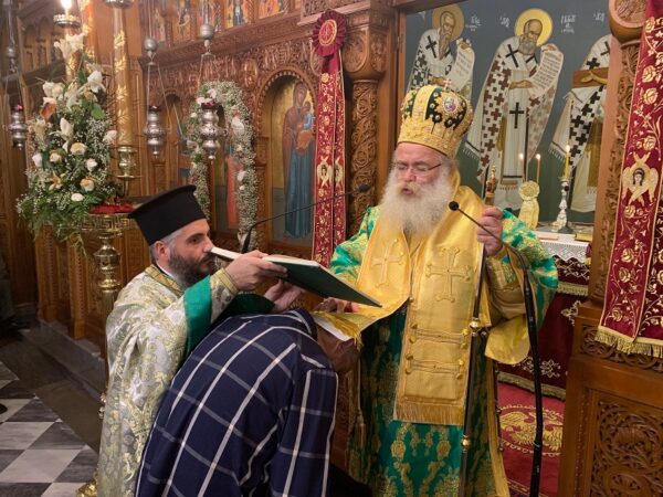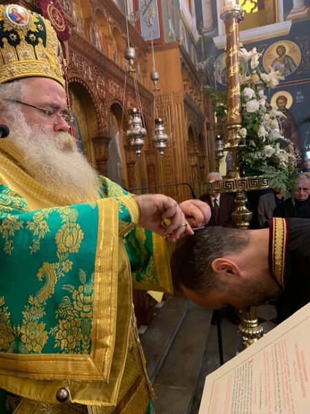 Πριν την Απόλυση, ο Σεβασμιώτατος χειροθέτησε σε Αναγνώστη τον κ. Ανδρέα Παπαγγελόπουλο, Αριστερό Ιεροψάλτη του Ναού, εξαίροντας την αφοσίωση και την αγάπη του για την ψαλτική τέχνη αλλά και τον ζήλο και την ολοπρόθυμη διακονία του στην επιτέλεση των ιερών Ακολουθιών στον Καθεδρικό Ναό της Αγίας Αικατερίνας.