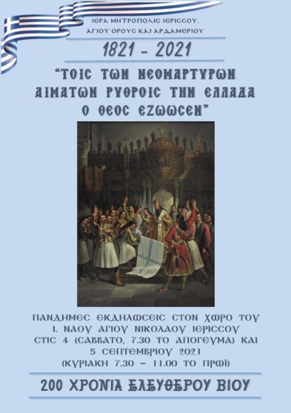 Διεξάγονται το Σαββατοκύριακο, 4 και 5 Σεπτεμβρίου, οι εκδηλώσεις της Ιεράς Μητροπόλεως Ιερισσού, Αγίου Όρους και Αρδαμερίου για την επέτειο των 200 χρόνων από την Επανάσταση του 1821. Για τούτο τον λόγο, ο Σεβασμιώτατος Μητροπολίτης Ιερισσού κ. Θεόκλητος απευθύνει έκκληση στον κόσμο να συμμετάσχει στις εκδηλώσεις, που ξεκινούν το Σάββατο στον αύλειο χώρο του Ιερού Ναού Αγίου Νικολάου Ιερισσού, και περιλαμβάνουν: