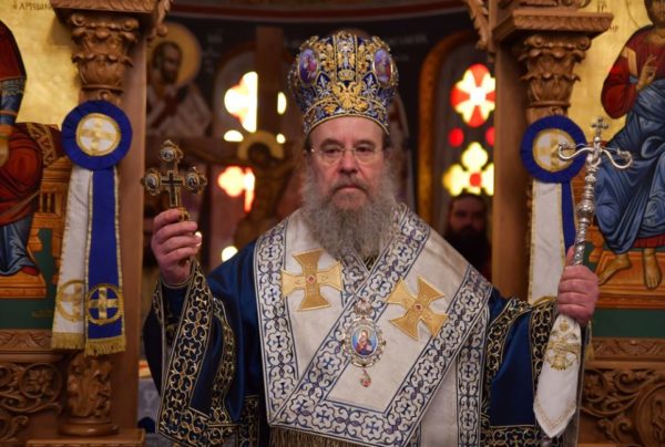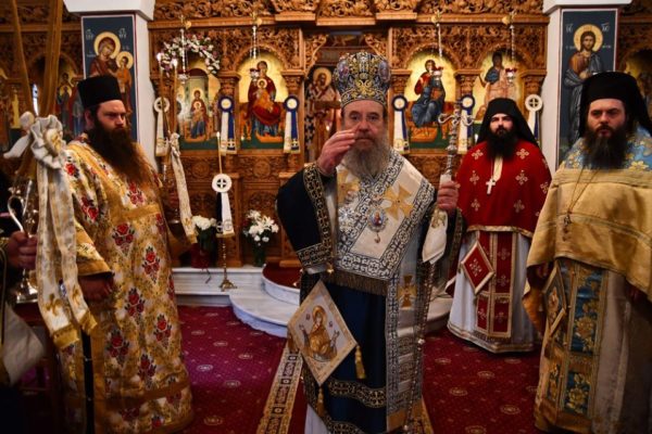 Προ της Αποδόσεως του υπέροχου Ύμνου «Την ωραιότητα Της Παρθενίας Σου…» προς την Πάναγνο, ο Σεβασμιώτατος με μεστό αλλά σύντομο λόγο, απήντησε ουσιαστικά στο ερώτημα «Γιατί η Ορθοδοξία τιμά τόσο εμφαντικά το πρόσωπο της Κυράς των Αγγέλων». Και η απάντηση ήταν ότι το Πάναγνο και Πάγκαλλο αυτό Ιερό πρόσωπο από τη θεολογία της Εκκλησίας χαρακτηρίζεται «Καινός Ουρανός», «Καινή Γη», «Καινός Παράδεισος», σύμφωνα με τη φρασεολογία του Αγίου Νικολάου του Καβάσιλα και μάλιστα στην ομιλία του για τον Ευαγγελισμό της Αειπαρθένου. Καινός Ουρανός, γιατί χώρεσε και φιλοξένησε μέσα στα σπλάγχνα Της Εκείνον που έκλινε τους Ουρανούς και κατέβη για τη Σωτηρία του Ανθρώπου, γενόμενος άνθρωπος! Καινή Γη, γιατί το φύραμα το ανθρώπινο με το σκοτισμένο κατ’ εικόνα από την αμαρτία και την πτώση, μέσα στη γαστέρα Της και πάλι νεουργήθηκε και αναπλάστηκε, ενωμένο κατά πάντα με τη Θεία και Πανάμωμη Φύση του Υιού και Λόγου του Θεού, του Χριστού. Και Νέος Παράδεισος, γιατί τον κλεισμένο επί χιλιάδες χρόνια Παράδεισο εξ αιτίας της πτώσης του Αδάμ και της Εύας, τον άνοιξε διάπλατα η Αειπάρθενος με τι να τέξη, να γεννήση, τον Τέλειο Θεό και Τέλειο Άνθρωπο Ιησού Χριστό.